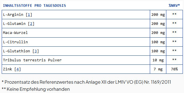 Per daglig dose (2 kapsler) inneholder produktet: L-arginin (200 mg), L-glutamin (200 mg), maca-rot (200 mg), L-citrullin (100 mg), L-glutathion (100 mg), Tribulus terrestris-pulver (10 mg) og sink (7 mg = 70 % NRV). Arginin og citrullin er aminosyrer som er knyttet til nitrogenoksidmetabolismen i kroppen. Du finner oversiktsartikler om dette på PubMed (f.eks. om arginin/NO). Sink er et essensielt sporstoff; godkjente EU-påstander refererer blant annet til opprettholdelse av et normalt testosteronnivå i blodet samt normal fruktbarhet og reproduksjon, forutsatt at det er tilstrekkelig inntak av sink. Maca er en tradisjonell rot; Tribulus er et planteekstrakt – begge brukes i kosttilskudd, men studiene er heterogene avhengig av endepunktet. Glutathion er et kroppseget tripeptid; glutamin er en av de proteinogene aminosyrene. Sett inntaket i sammenheng med et balansert kosthold, trening og restitusjon.